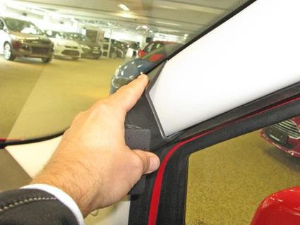 Use the enclosed alcohol pad to clean the area where the ProClip is to be installed. Pull out the rubber sealent on the A-post slightly. Remove the adhesive tape cover on the ProClip.