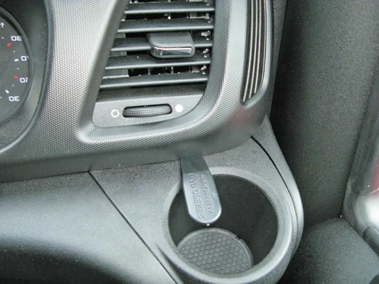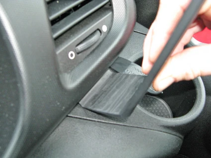 Press the thin end of the enclosed gap opener into the gap between the cup holder and dashboard, to widen the gap.