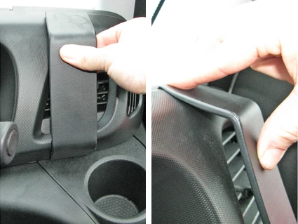 Press the ProClip upward/forward so the lower edge goes all the way into the gap. Hook the angled upper edge of the ProClip around the edge on top of the dashboard. Remove the gap opener.