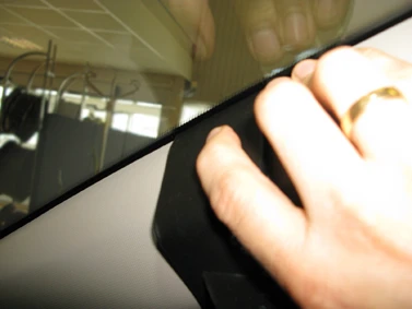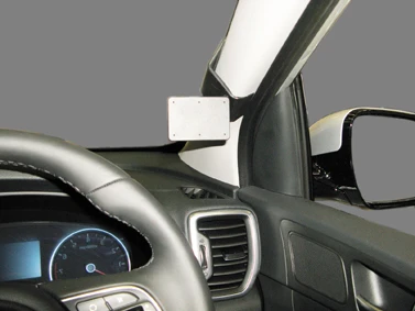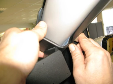 Press the upper part of the ProClip upward/forward so the angled edge hooks around the A-post. Press downward on top of the ProClip so the angled edge hooks properly in place.
