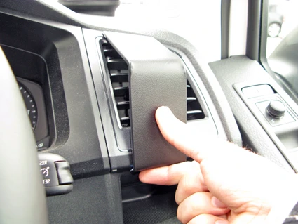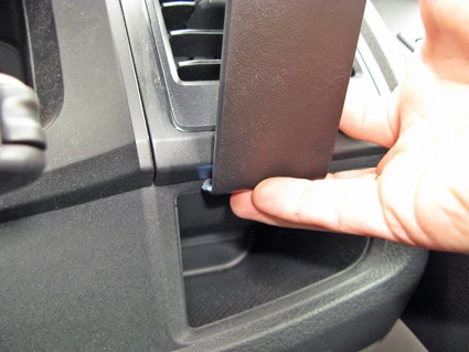 Use the enclosed alcohol pad to clean the area where the ProClip is to be installed. Remove the adhesive tape covers on the ProClip. Insert the lower angled edge of the ProClip into the gap between the frame surrounding the air vent and the remainder of the dash.
