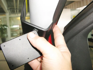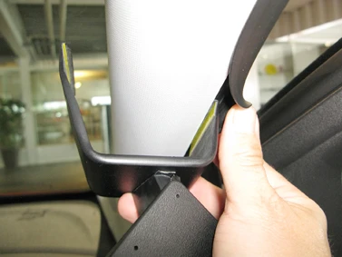 Press the upper part of the ProClip forward/upward so the angled edge hooks around the A-post. Press down on top of the ProClip so the angled edge hooks properly in place.