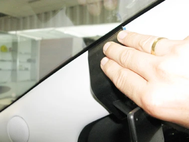 Use the enclosed alcohol pad to clean the area where the ProClip is to be installed. Peel off the adhesive tape covers on the ProClip. Pull out the rubber sealent on the A-post slightly.
