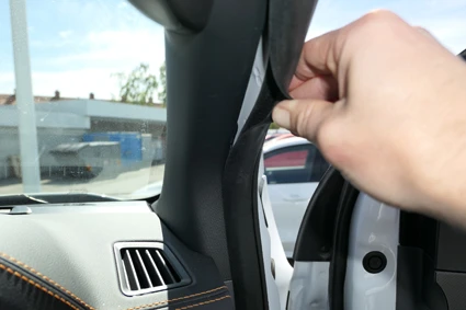 Use the enclosed alcohol pad to clean the area where the ProClip is to be installed. Pull out the rubber sealent on the A-post slightly. Remove the adhesive tape covers on the ProClip.