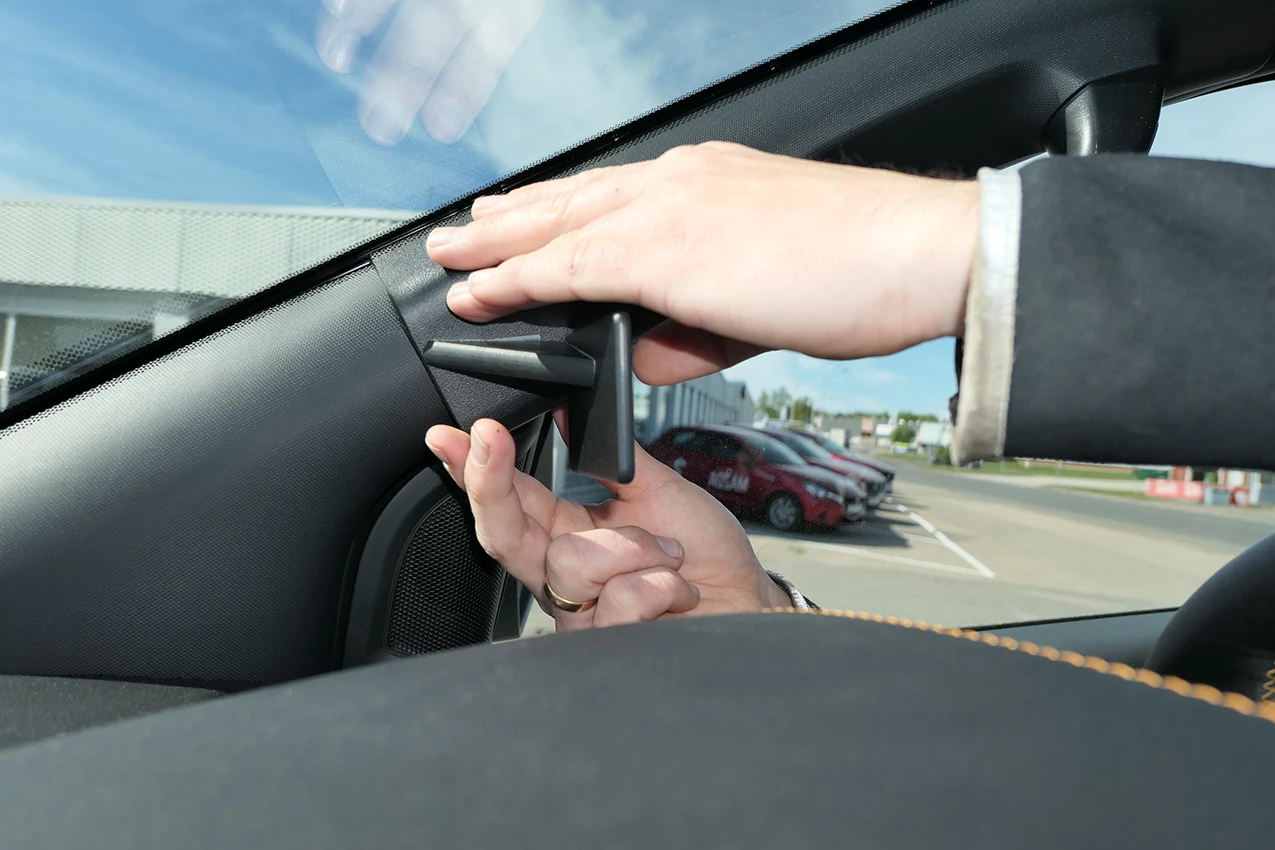 Press the angled edge on the lower part of the ProClip into the gap and hook it around the A-post.