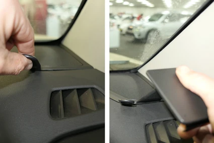 Press the thin edge of the enclosed gap opener into the gap between the frame surrounding the speaker vent and the dashboard, to widen the gap. Press the angled edge on the upper part of the ProClip into the gap next to the gap opener.