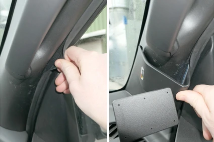 Use the enclosed alcohol pad to clean the area where the ProClip is to be installed. Remove the adhesive tape covers on the ProClip. Pull out the rubber sealent on the A-post slightly. Press the angled edge on the lower part of the ProClip into the gap and hook it around the A-post.