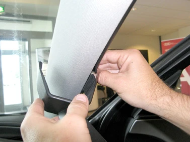 Press the angled edge on the lower part of the ProClip into the gap and hook it around the A-post.