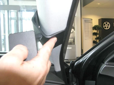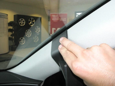 Press the ProClip upward/forward so the angled upper edge hooks around the A-post. Press down on top of the ProClip so you hear/feel it snaps into place.