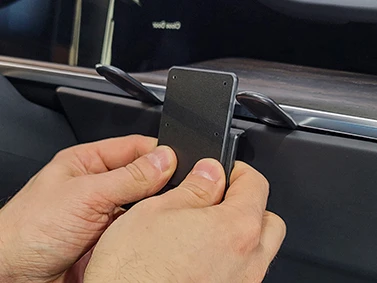 Press the gap openers into the gap between the dashboard panel and the silver trim. Place your fingers on the back of the ProClip. Pull gently up and towards you until the upper edge is seated into the gap, between the gap openers. Remove the gap openers.