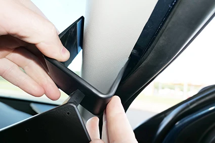 Use the enclosed alcohol pad to clean the area where the mount is to be installed. Peel off the adhesive tape cover. Pull out the rubber sealent on the A-post. Press the lower part of the mount into the gap and hook it behind the A-post.