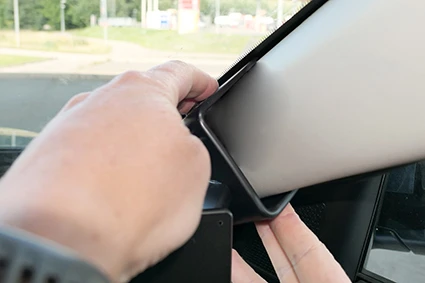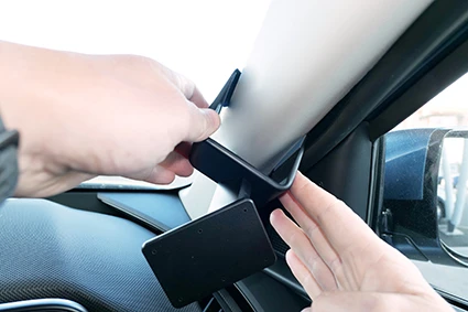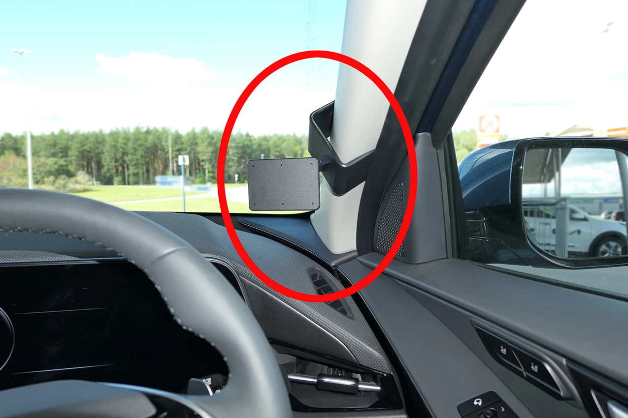 Press the mount forward/upward so the angled upper edge hooks around the A-post.