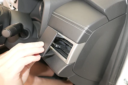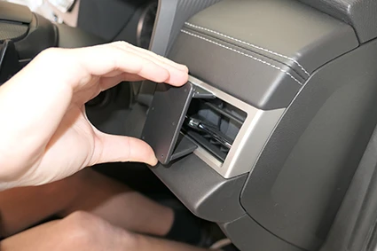 Use the enclosed alcohol pad to clean the area where the ProClip is to be installed. Peel off the adhesive tape covers on the ProClip. Hook the upper edge of the ProClip under the frame surrounding the air vent.