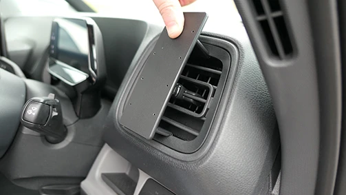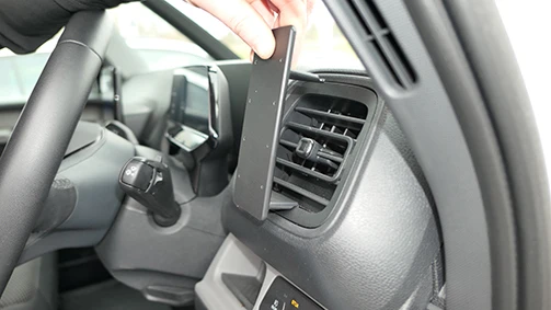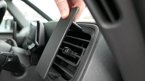 Hook the upper edge of the mount under the frame surrounding the air vent housing.