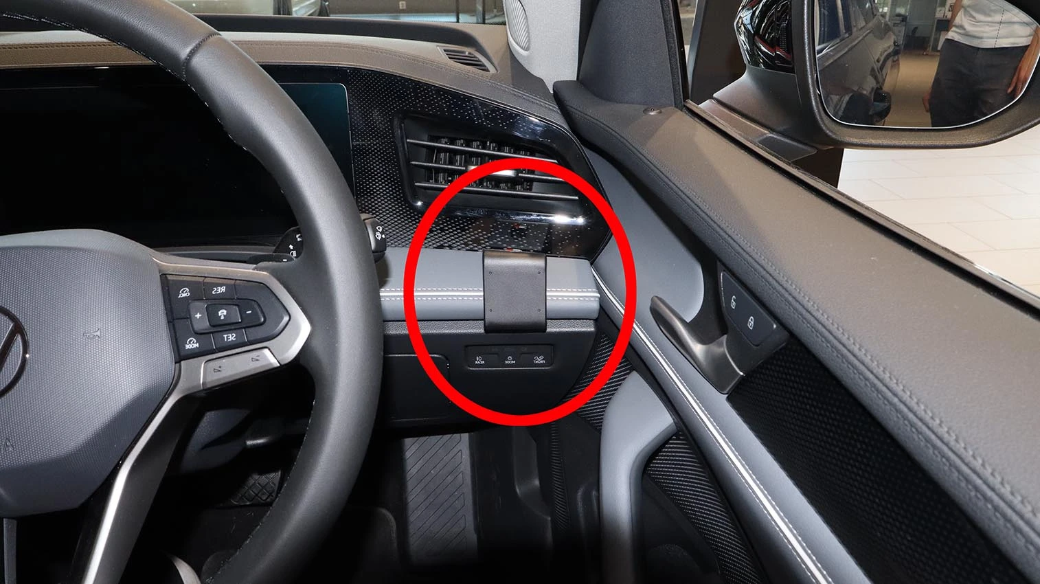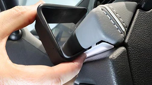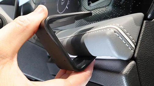 Press the lower edge of the mount into the gap between the trim and the padded dashboard.