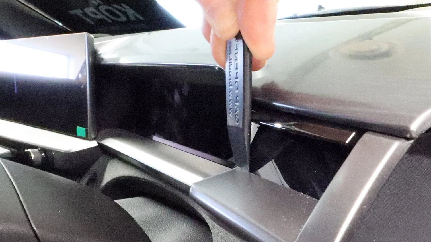 Press the thin end of the enclosed gap opener into the gap between the panel and the trim. Use the enclosed alcohol pad to clean the area where the mount will be installed. Peel off the adhesive tape cover.