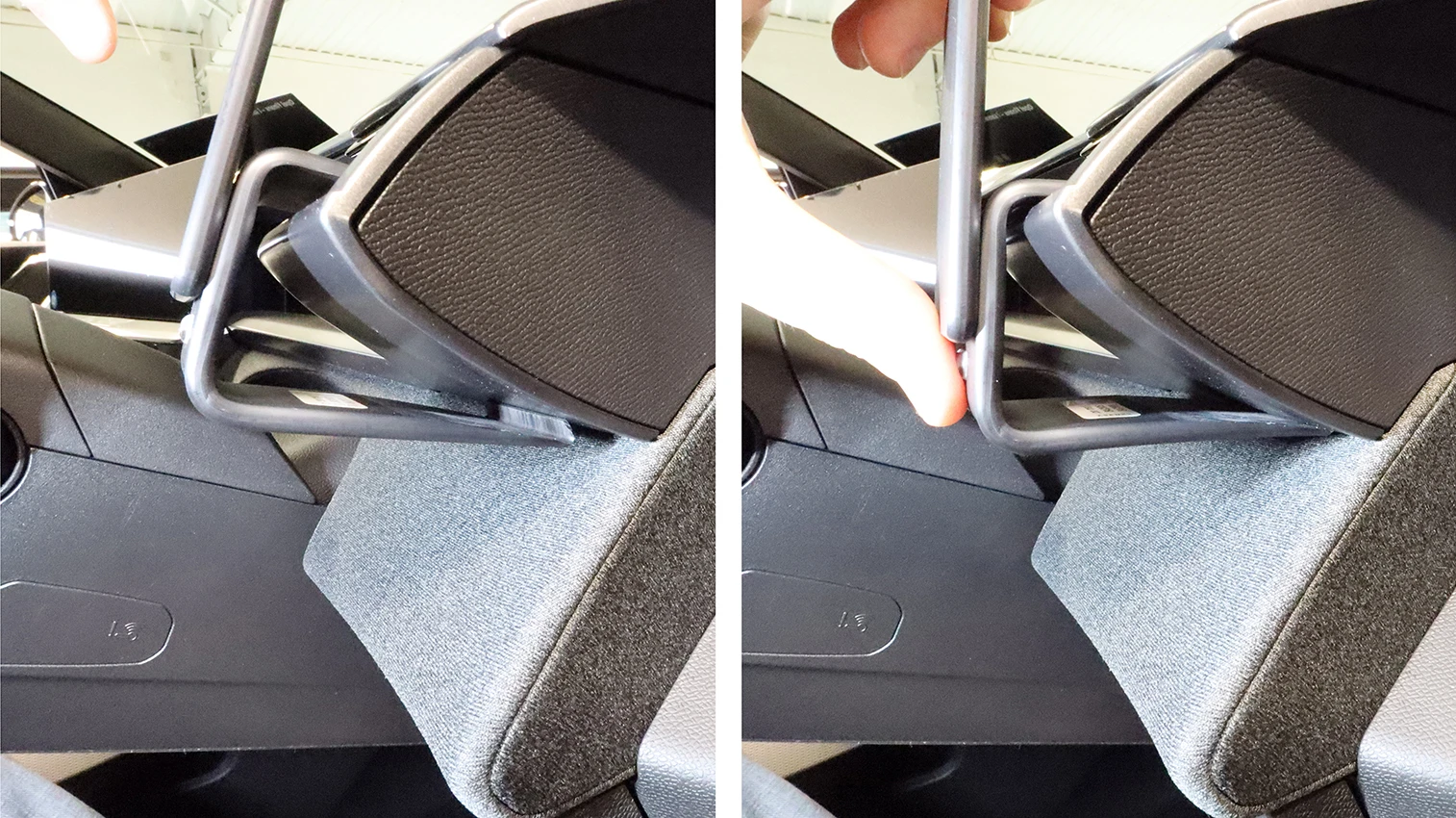 Press the lower edge of the mount downward and forward. Press forward on the lower part of the mount so the lower edge hooks between the dashboard sections.