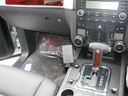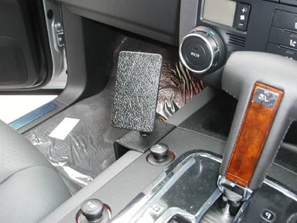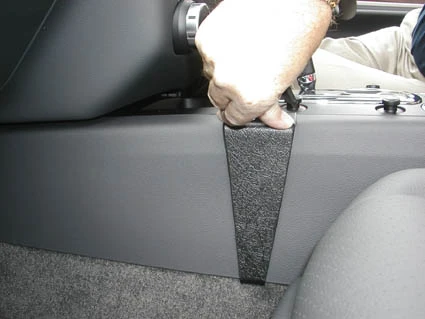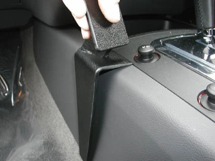 Press down on the left side of the ProClip so the angled edge on the left side hooks under the console edge by the floor. (You may have to place your fingers further down on the ProClip and press towards the center console for the angled edge to hook under console edge)