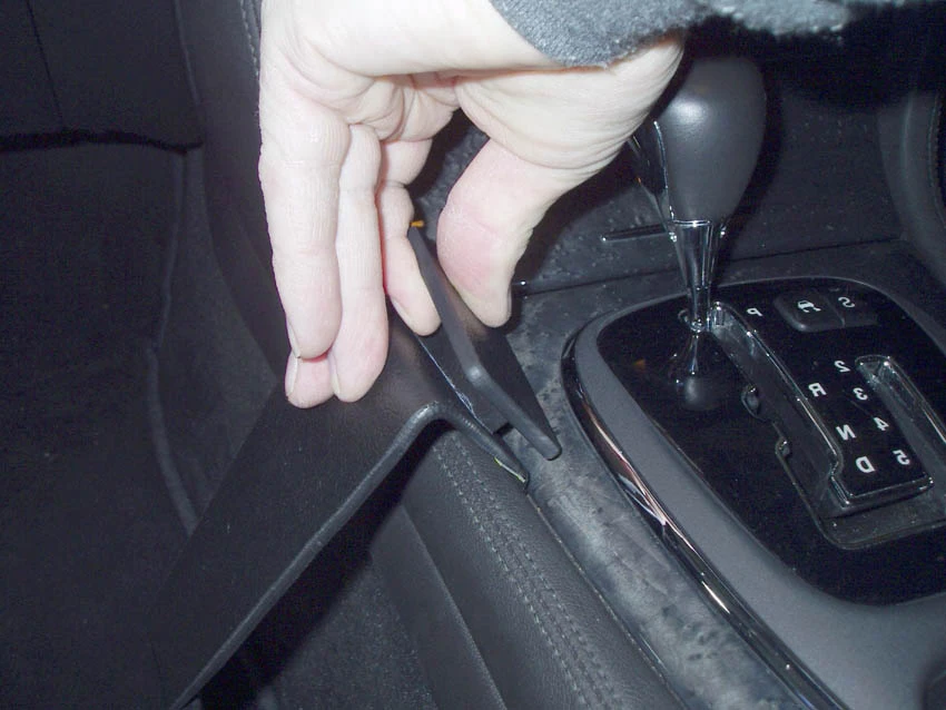 Peel off the adhesive tape covers on the ProClip. Press the curved edge on the right part of the ProClip into the gap between the wood grain panel and the console.