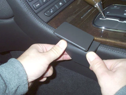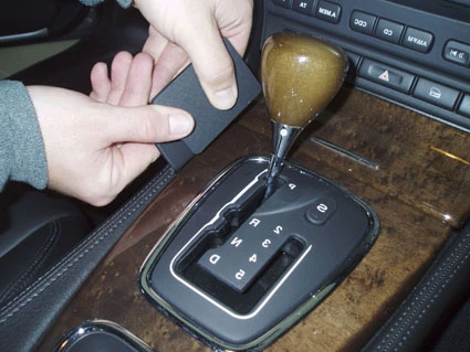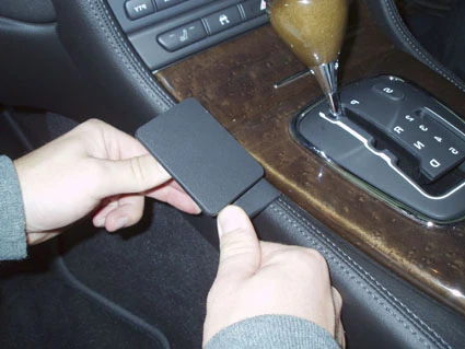 Peel off the adhesive tape covers on the ProClip. Press the angled upper edge of the ProClip into the gap between the panel surrounding the gear shift and the console.