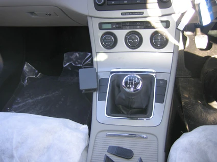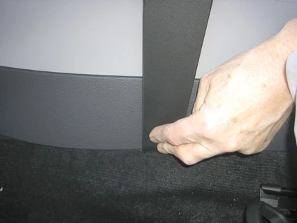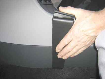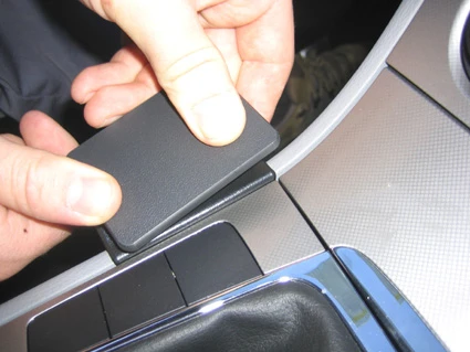 Peel off the adhesive tape covers on the ProClip. Press the angled edge on the right side of the ProClip into the gap between the panel surrounding the gear shift and the edge of the console.