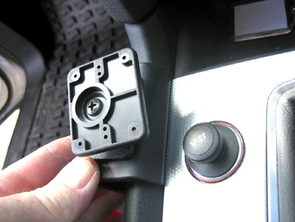 Peel off the adhesive tape covers on the ProClip. Hook the angled edge on the right part of the ProClip over the edge of the console.