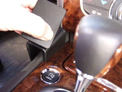 Peel off the cover of adhesive tape on the ProClip. Press the thin edge on the right side of the ProClip into the gap above the between the center console panel and the console edge.