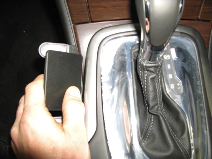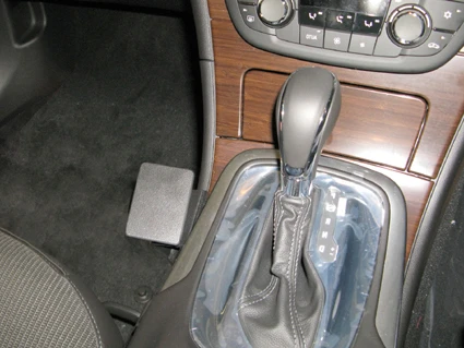 Use the enclosed alcohol pad to clean the area where the ProClip is to be installed. Press the thin end of the enclosed gap openers into the gap between the panel surrounding the gear shift and the console frame, to widen the gap. Peel off the cover of the adhesive tape on the ProClip.