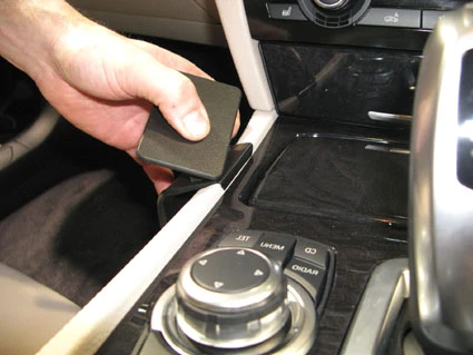 Use the enclosed alcohol pad to clean the area where the ProClip is to be installed. Peel off the adhesive tape cover on the ProClip. Place the angled edge on the right part of the ProClip over the edge of the console.