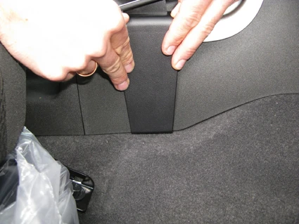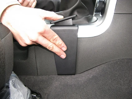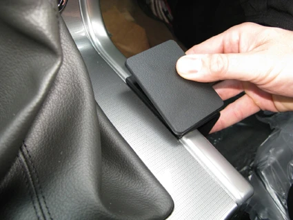 Use the enclosed alcohol pad to clean the area where the ProClip is to be installed. Peel off the adhesive tape covers on the ProClip. Hook the angled edge on the left side of the ProClip over the edge of the console.