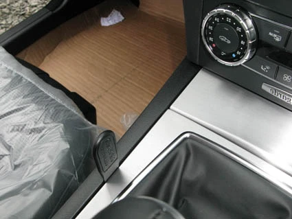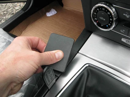 Use the enclosed alcohol pad to clean the area where the ProClip is to be installed. Press the thin end of the enclosed gap opener into the gap between the edge of the console and the panel surrounding the gear shift. Peel off the adhesive tape cover on the ProClip.