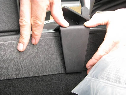 Press downward on the left side of the ProClip so the lower angled edge hooks under the console sidewall. Pull out the gap opener.
