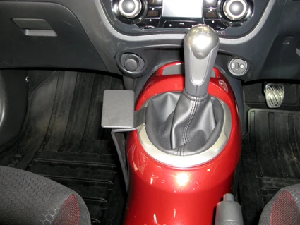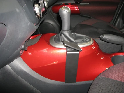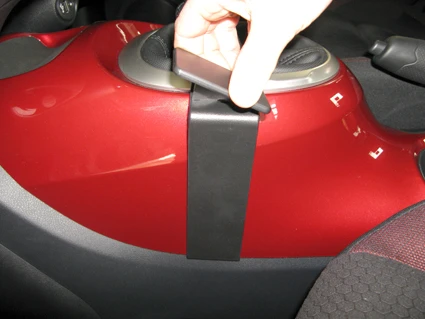 Use the enclosed alcohol pad to clean the area where the ProClip is to be installed. Peel off the cover of adhesive tape on the ProClip. Hook the angled edge on the right side of the ProClip over the frame surrounding the gear shift gaiter.