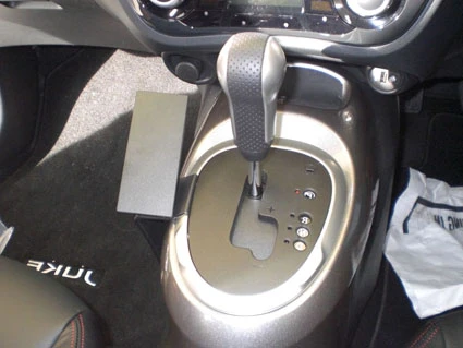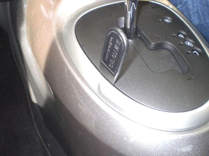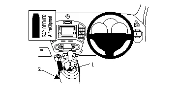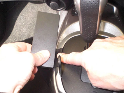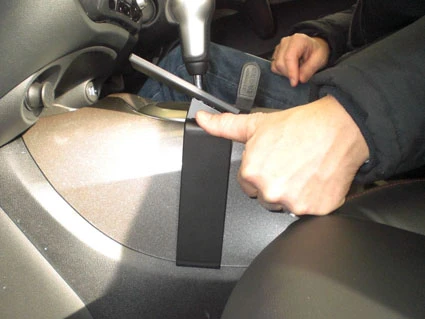 Use the enclosed alcohol pad to clean the area where the ProClip is to be installed. Press the thin end of the enclosed gap opener into the gap between the panel surrounding the gear shift and the console, to widen the gap. Peel off the cover of adhesive tape on the ProClip.