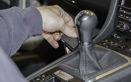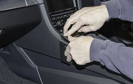 Press downward firmly on the left side of the ProClip so it flexes down towards the floor. Press until the angled edge on the lower part of the ProClip hooks around the console sidewall edge.