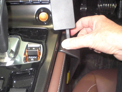 Press downward on the ProClip so the lower angled edge hooks under the lower section of the console sidewall.