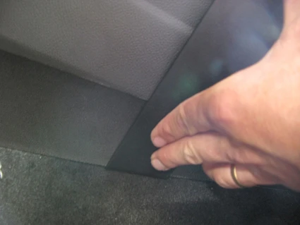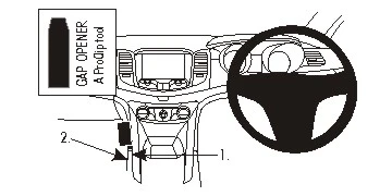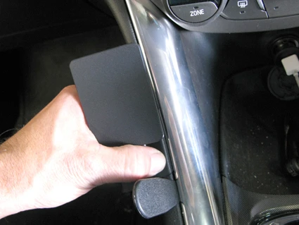 Use the enclosed alcohol pad to clean the area where the ProClip is to be installed. Press the enclosed gap opener into the gap between the console sidewall and the panel, to widen the gap. Remove the adhesive tape covers on the ProClip. Press the angled edge of the ProClip into the gap above the gap opener. Remove the gap opener.