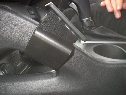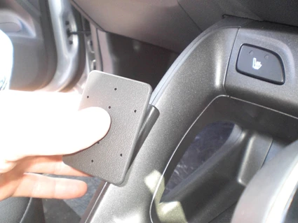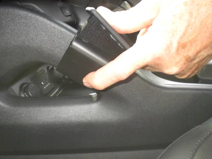 Press down on top of the ProClip so it flexes downward and the angled edge on the lower part of the ProClip hooks around the lower console edge. Push on the lower part of the ProClip to make sure the angled edge is hooked all way around.