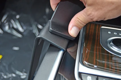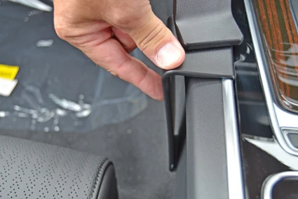 Use the enclosed alcohol pad to clean the area where the ProClip will attach. Remove the adhesive tape cover on the ProClip. Hook the upper right edge of the ProClip over the right edge of the top of the left console side panel.
