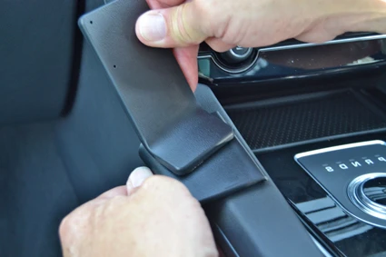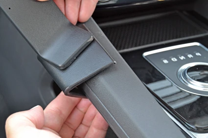 Use the enclosed alochol pad to clean the area where the ProClip is to be installed. Remove the adhesive tape cover on the ProClip. Press the angled edge on the lower part of the ProClip into the gap in the console sidewall.