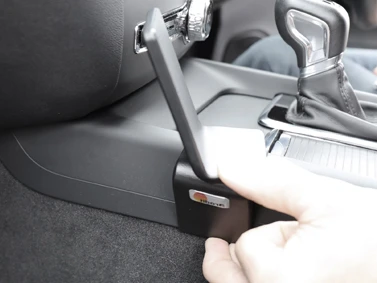 Press downward on the left side of the ProClip so the angled edge on the left part of the ProClip hooks under the console sidewall.
