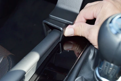 Use the enclosed alcohol pad to clean the area where the ProClip is to be installed. Press the thin end of the enclosed gap opener into the gap between the center console edge and the panel surrounding the gear shift, to widen the gap (the lower inside gap). Peel off the adhesive tape cover on the ProClip.