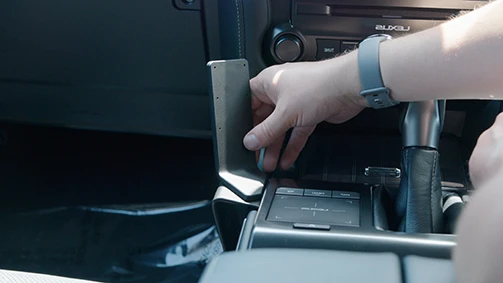 Press dorn on the left side of the mount so the angled lower edge hooks into the gap between the gap opener. Press the left side of the mount upward toward the center console frame, so the angled edge goes all the way into the gap. Pull out the gap openers.