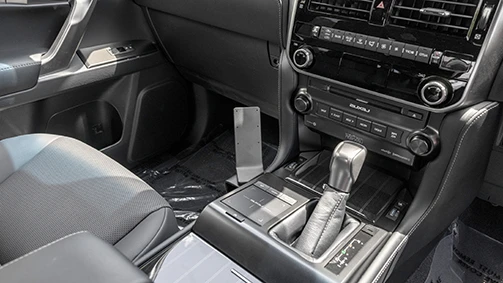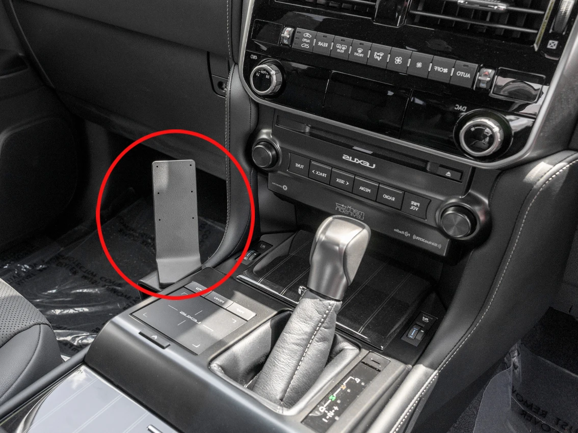 Use the enclosed alcohol pad to clean the area where the mount is to be installed. Peel off the adhesive tape cover. Hook the right part of the mount over the center console frame.