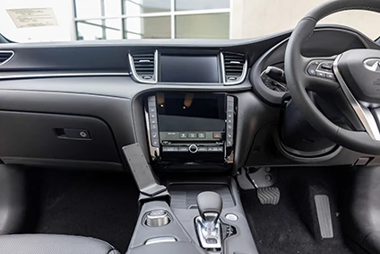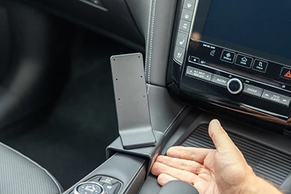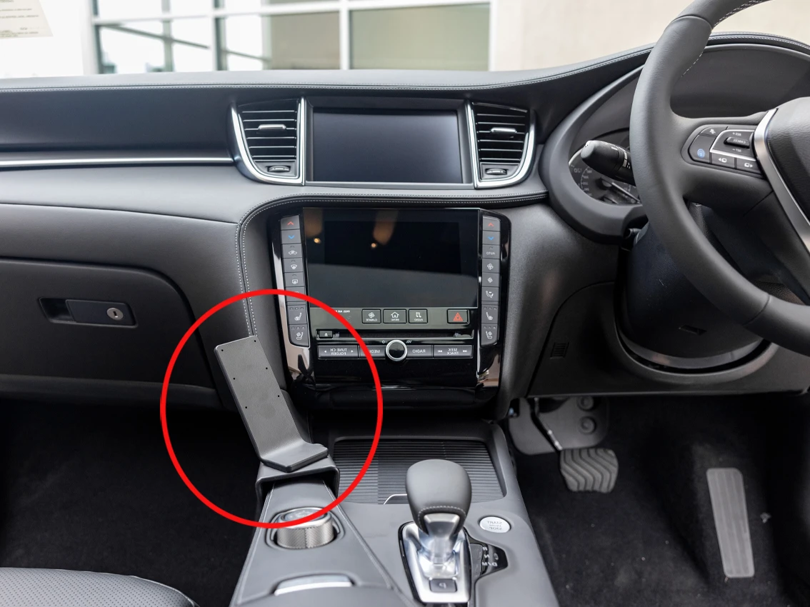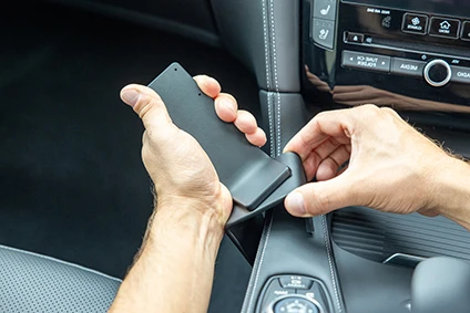 Hook the angled edge over the padded console frame. Press the upper and lower edges of the mount toward the center console so they are properly in place.