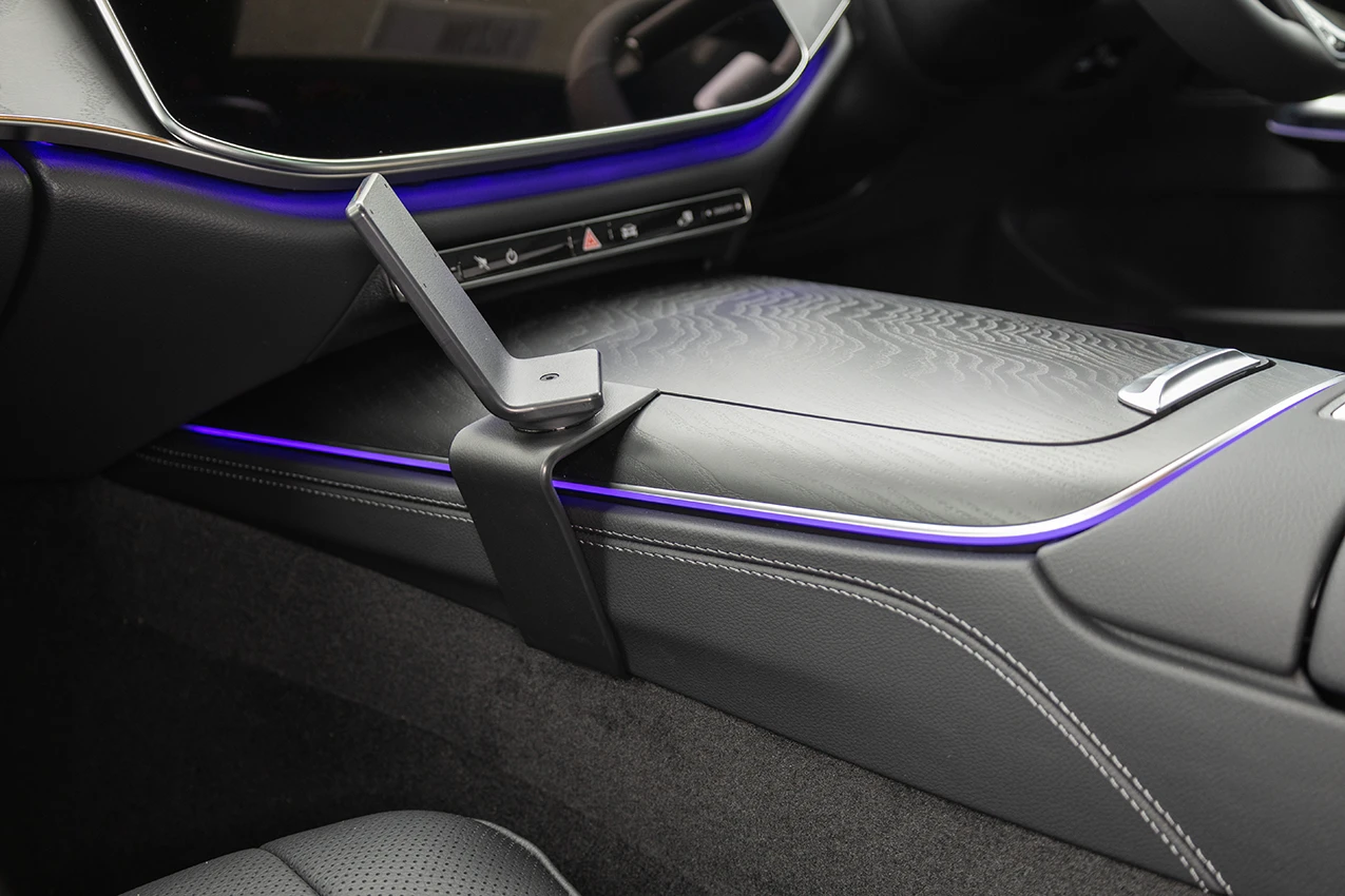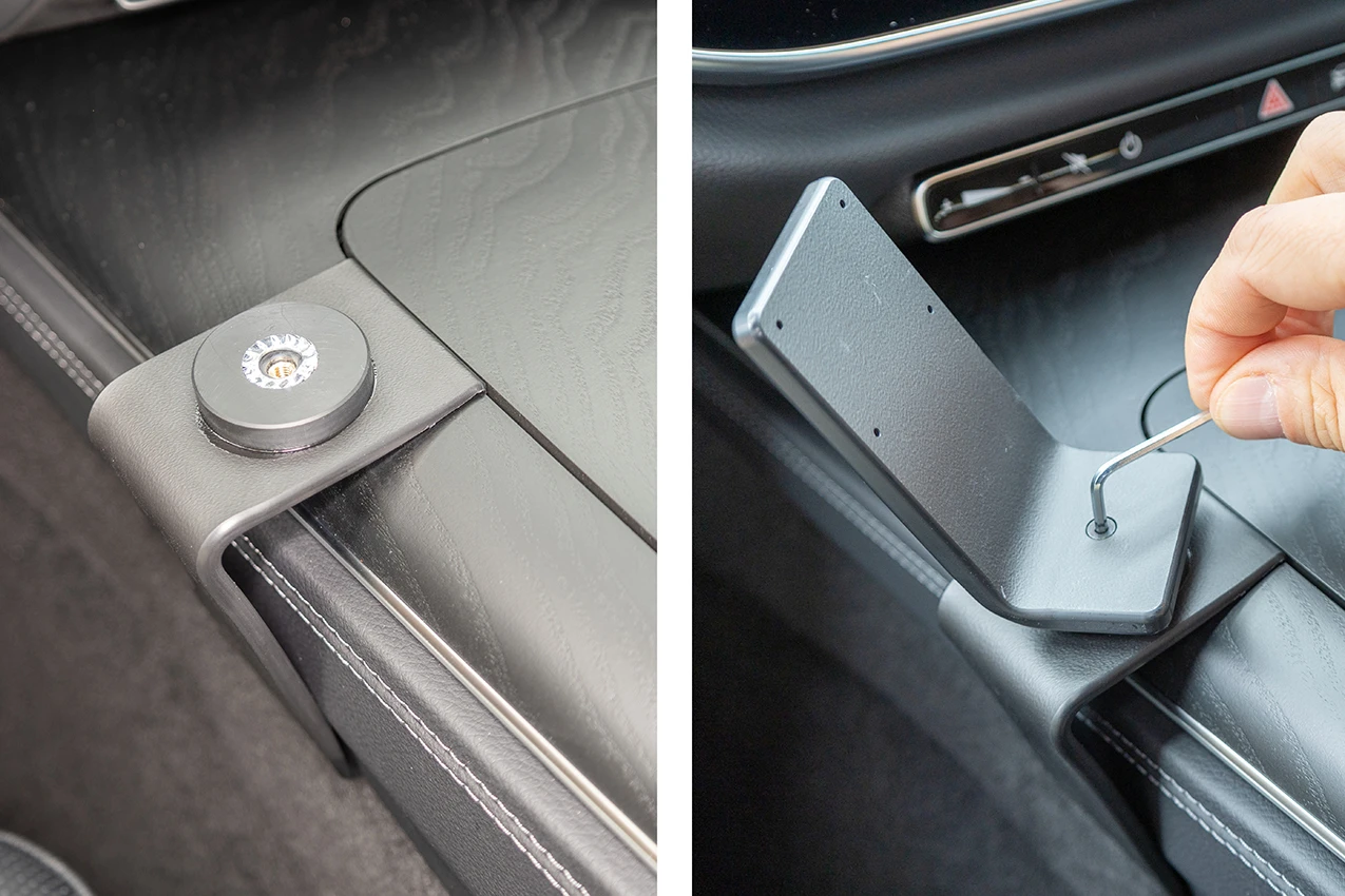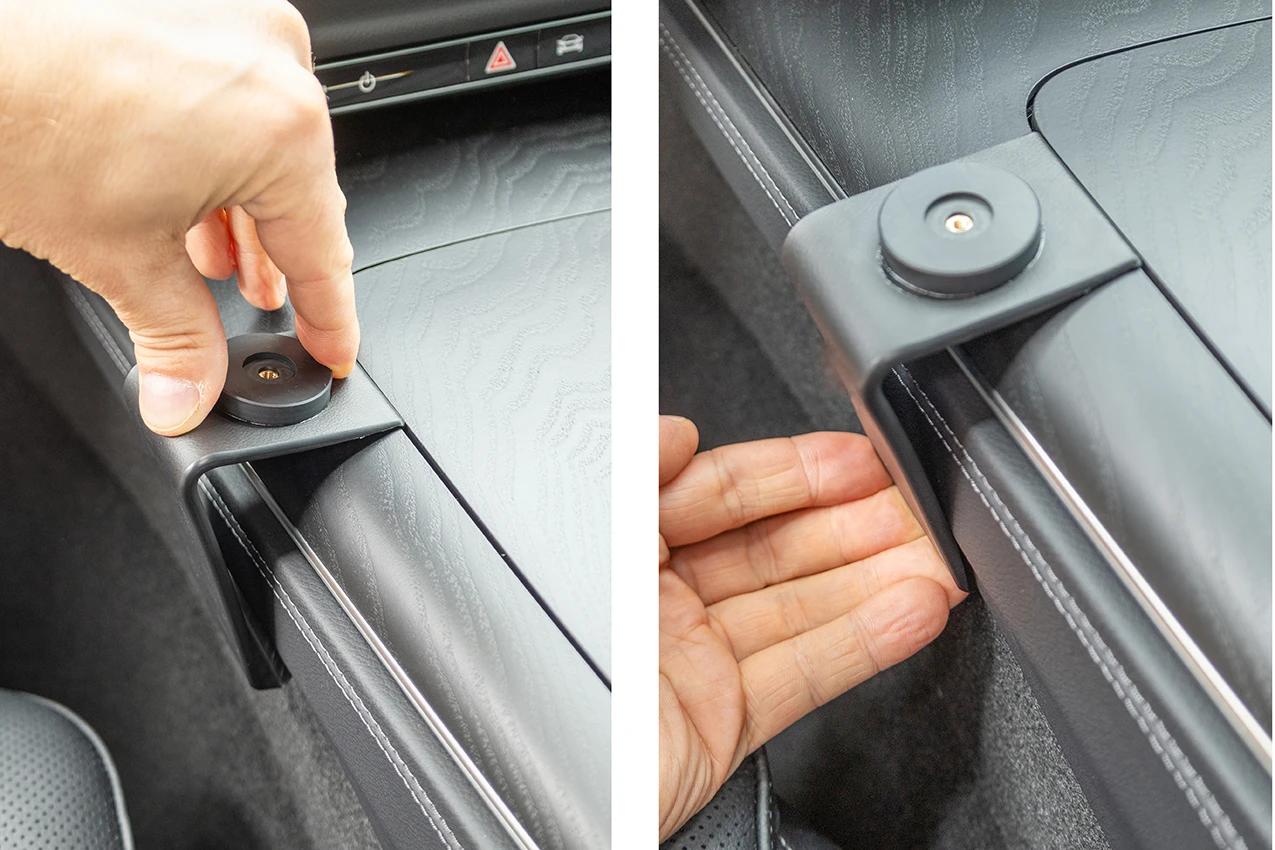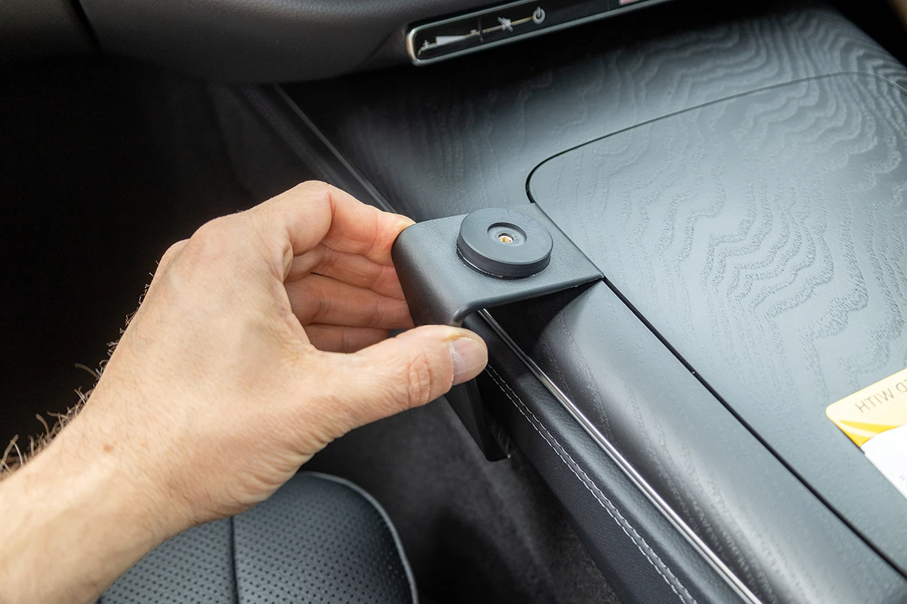 Hook the upper edge of the mount into the gap between the console and the accessory tray door. Position the mount just before the curved corner of the accessory tray.