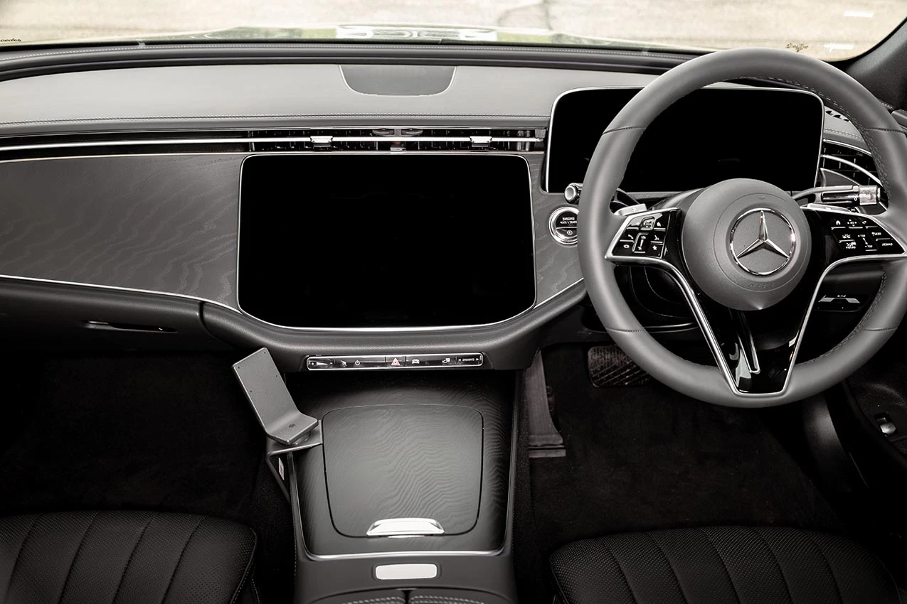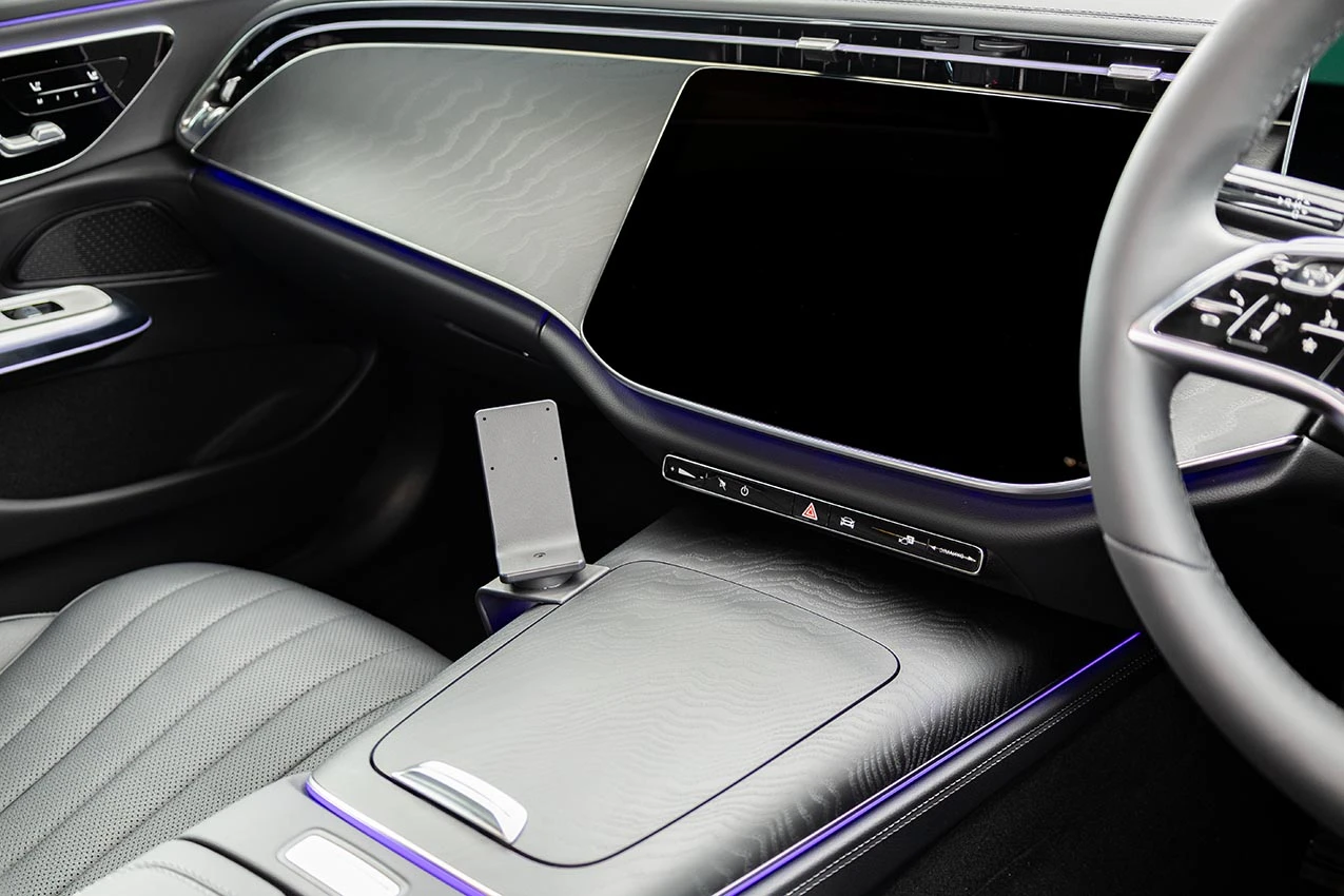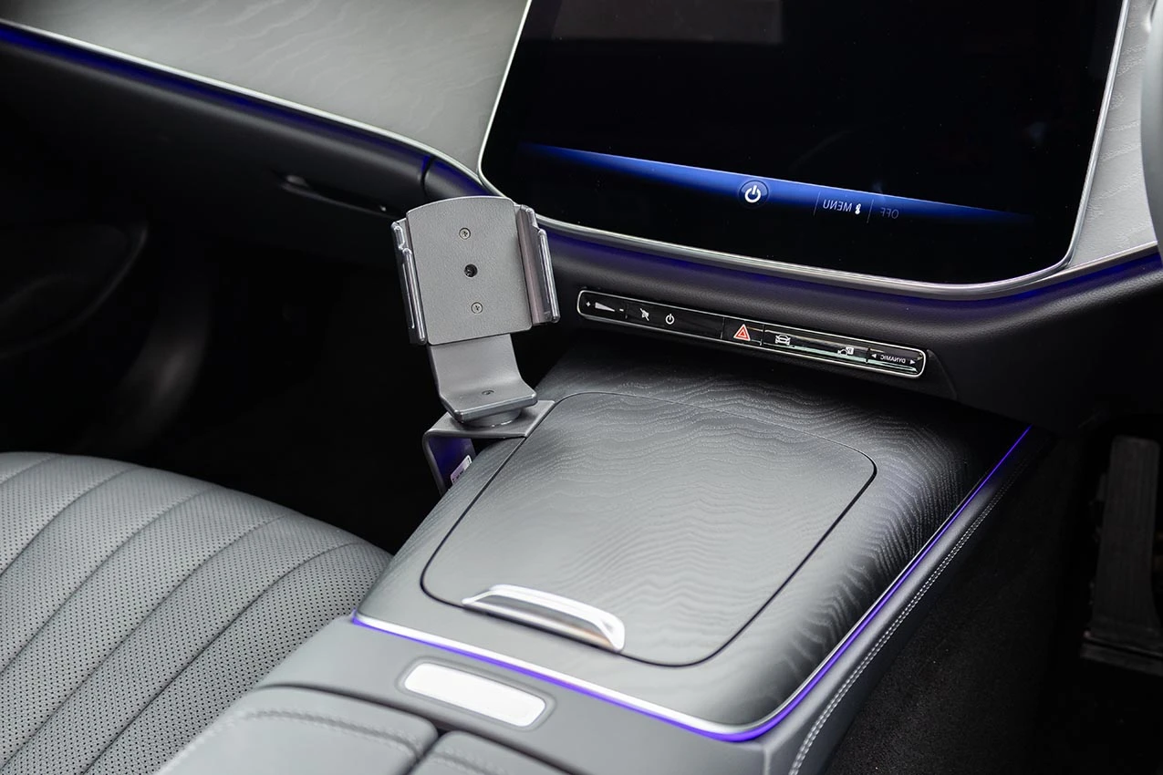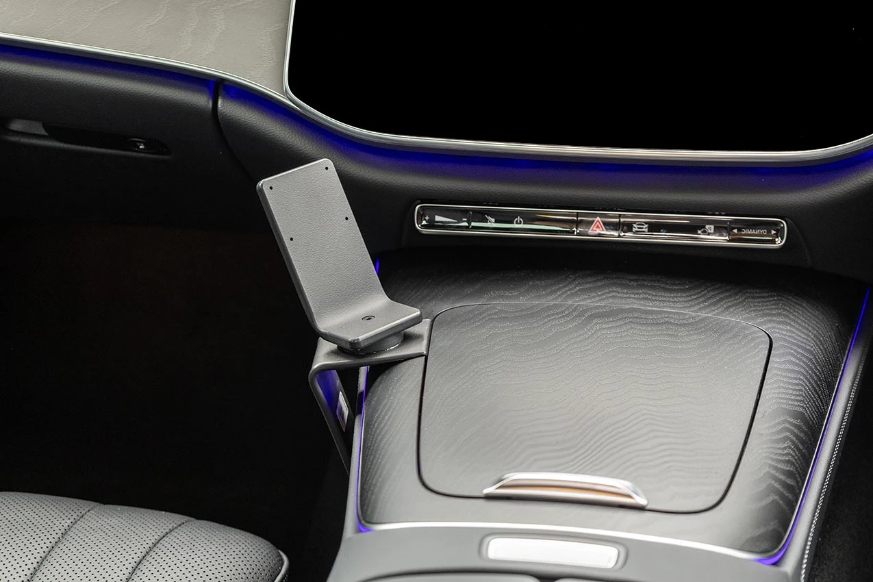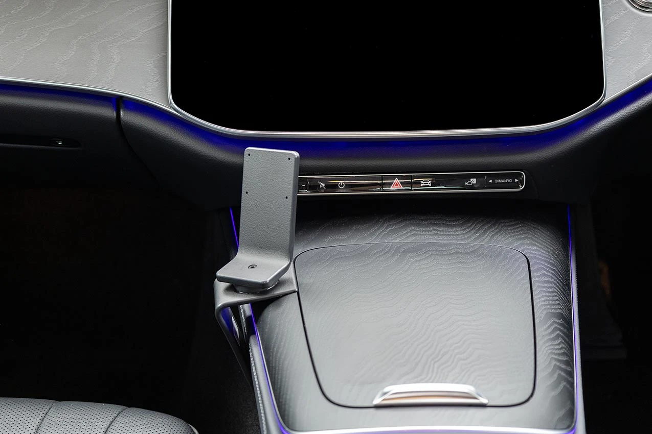 Hook the upper edge of the mount into the gap between the console and the accessory tray door. Position the mount just before the curved corner of the accessory tray.