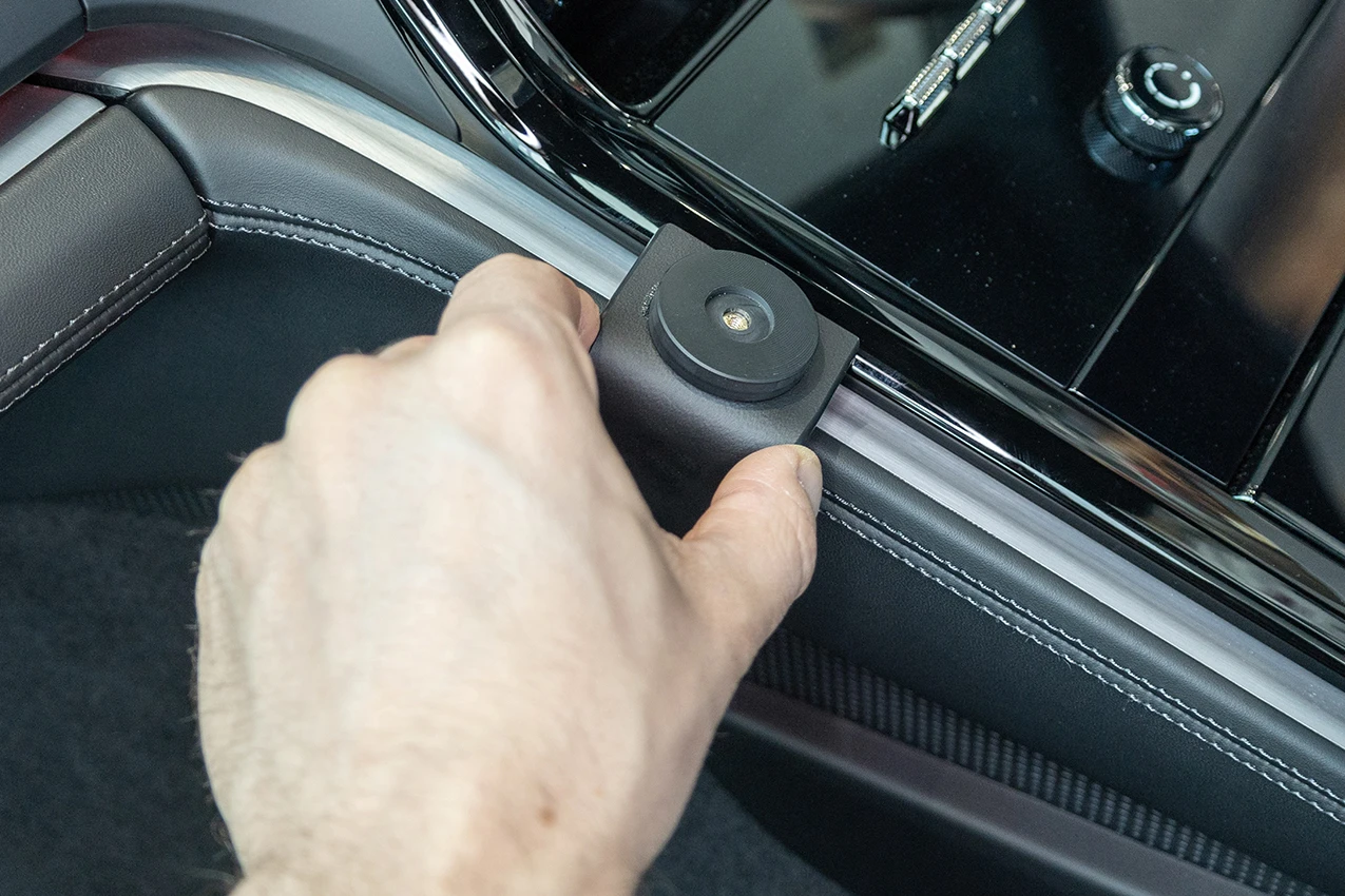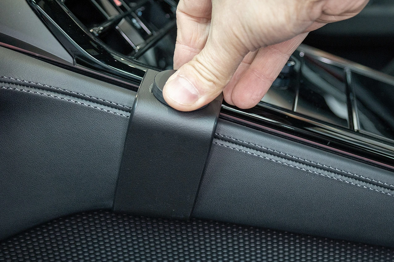 Use the enclosed alcohol pad to clean the area where the mount will be installed. Peel off the adhesive tape cover. Position the mount in line with the console switches. Place the mount on the console side, so the edge rests against the raised console trim.