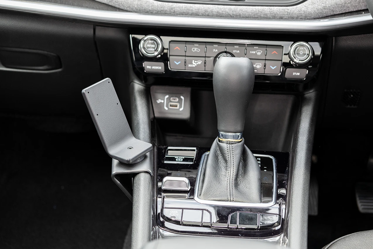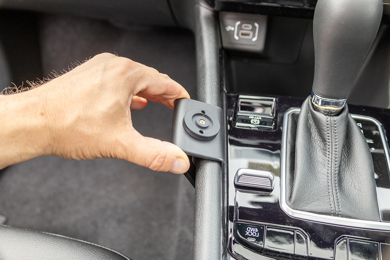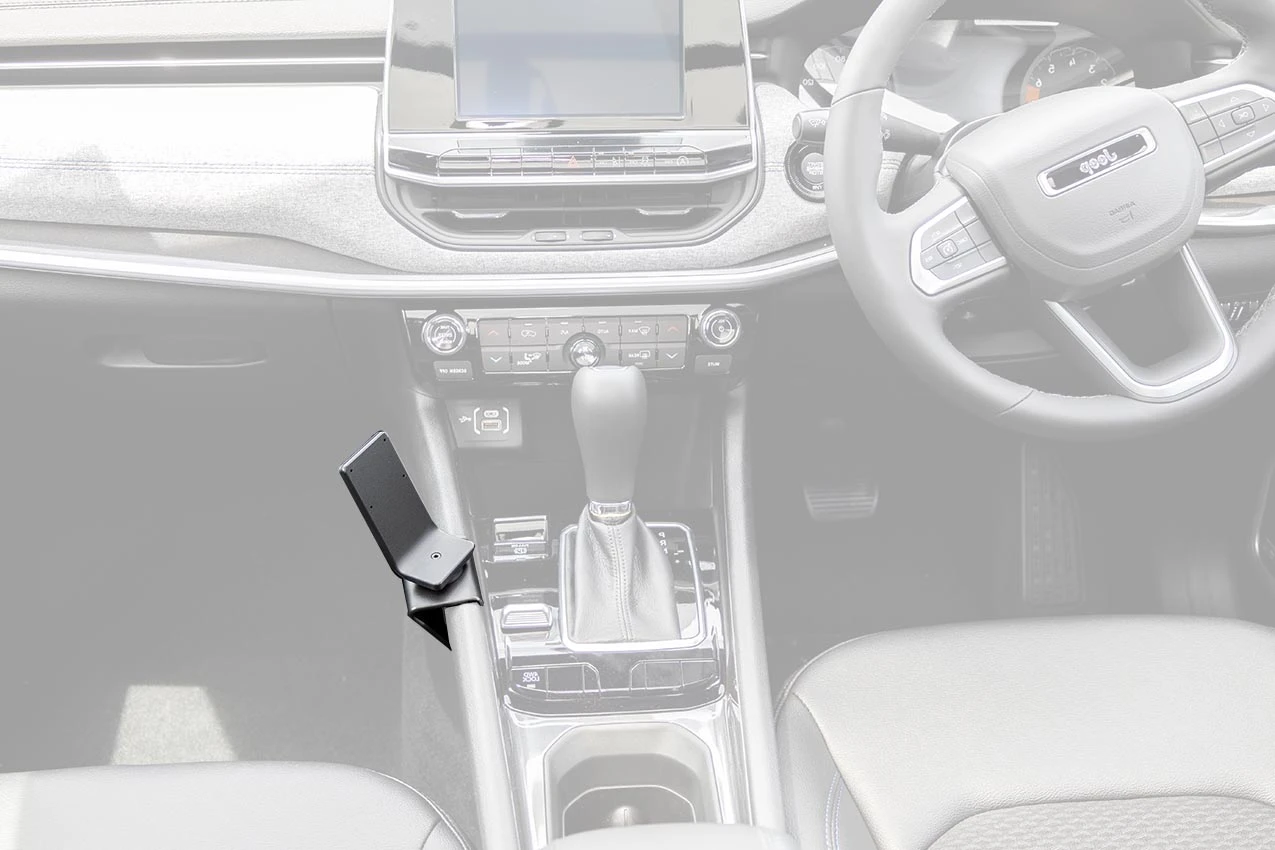 Align the mount between the park lever and drive mode switch, as shown in the picture. Hook the upper edge of the mount over the console frame edge.