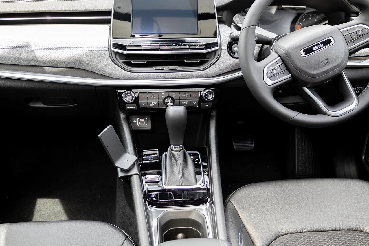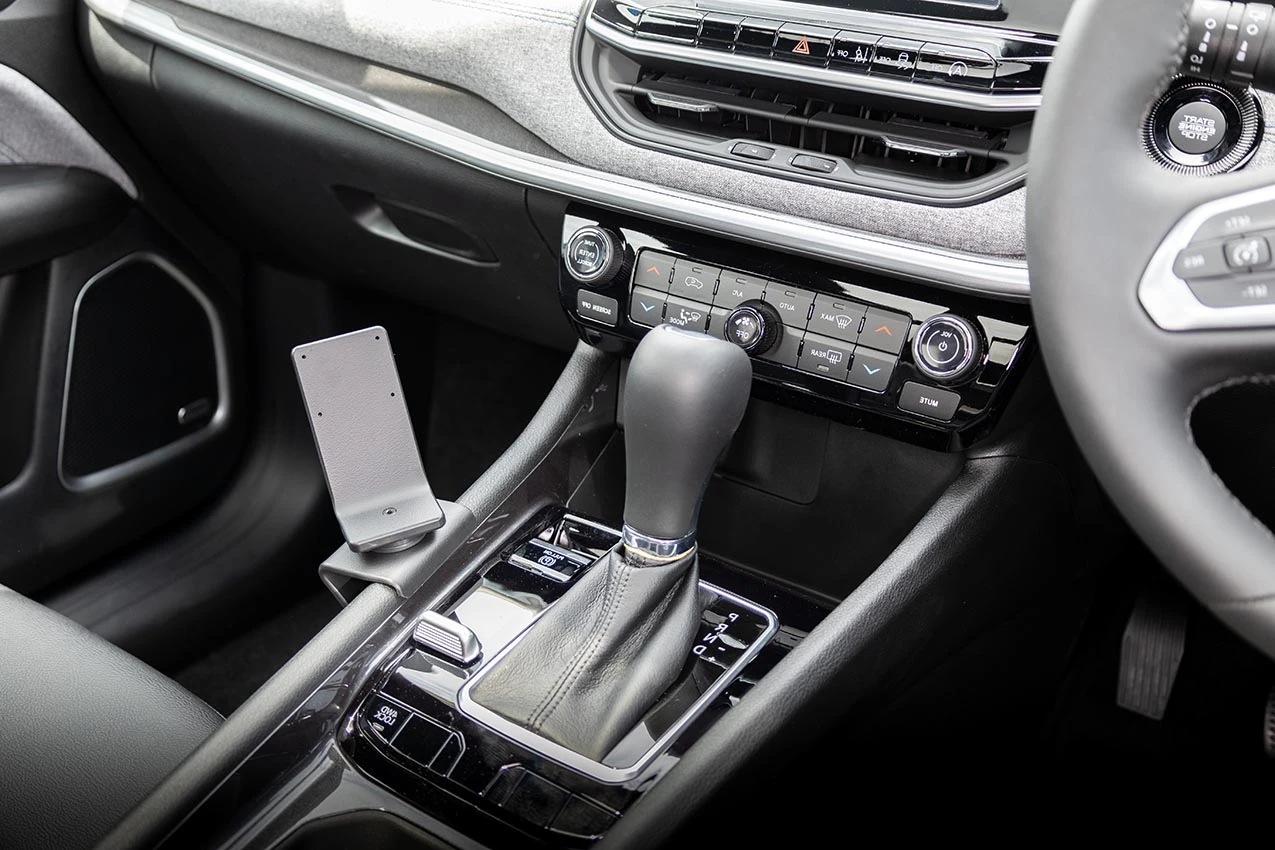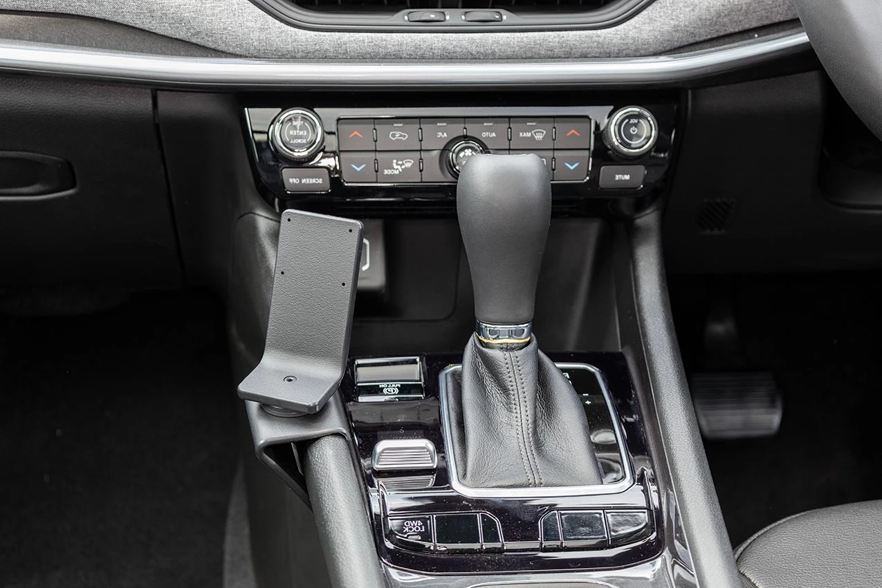 Align the mount between the park lever and drive mode switch, as shown in the picture. Hook the upper edge of the mount over the console frame edge.